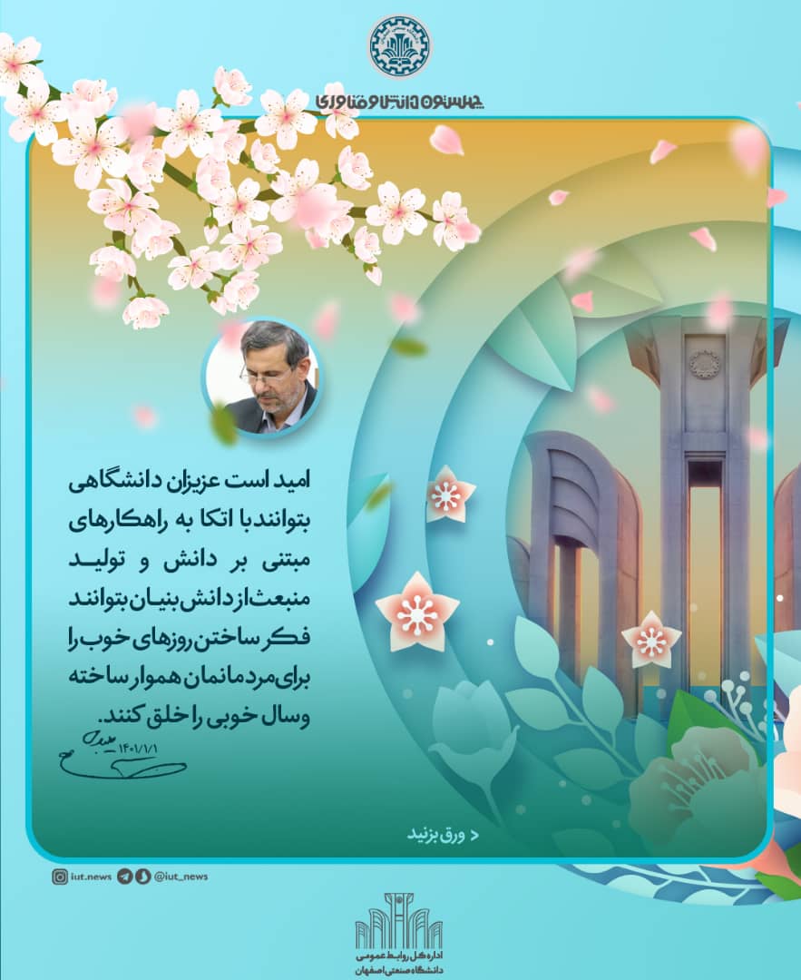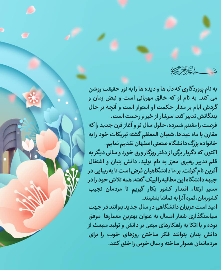 فرصت را مغتنم شمرده، حلول سال نو و آغاز قرن جدید را که مقارن با ماه عیدها، شعبان المعظم گشته تبریکات خود را به خانواده بزرگ دانشگاه صنعتی اصفهان تقدیم نمایم.