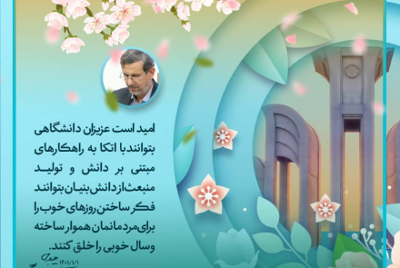 اکنون که دگربار برگی از دفتر روزگار ورق خورد و سالی دیگر به قلم تدبیر رهبری معزز به نام تولید، دانش بنیان و اشتغال آفرین نام گرفت، بر ما دانشگاهیان فرض است تا به زیبایی در جبهه دانشگاه این مطالبه را لبیک گفته، همه تلاش خود را در مسیر ارتقاء اقتدار کشور بکار گیریم تا مردمان نجیب کشورمان، ثمره آنرا به تماشا بنشینند.