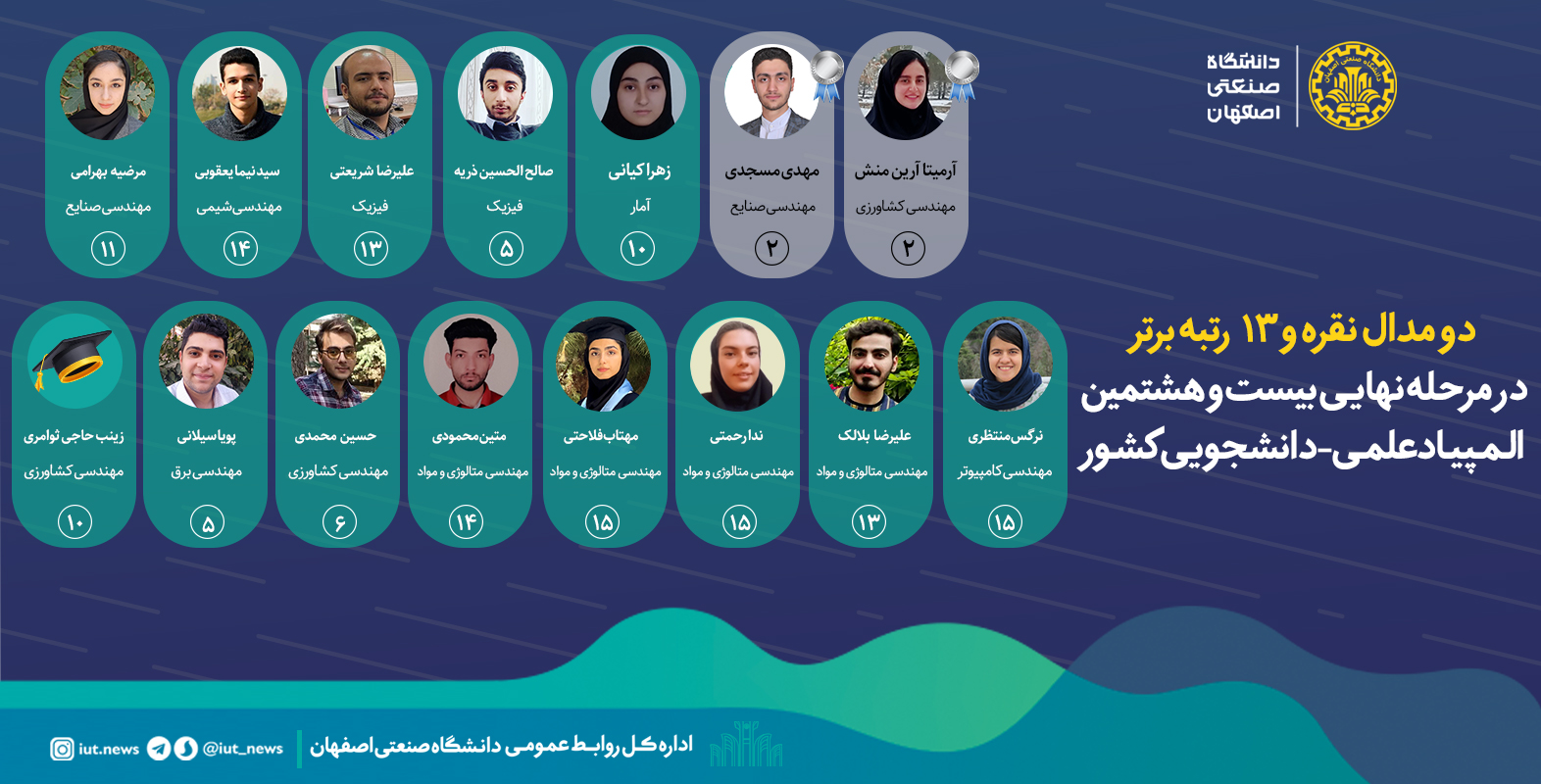 سید نیما یعقوبی در رشته مهندسی شیمی و متین محمودی طریقی در رشته مهندسی مواد و متالورژی رتبه ۱۴ را کسب کردند.