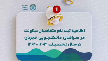 اطلاعیه : قابل توجه کلیه دانشجویان متقاضی سکونت در سراهای دانشجویی مجردی در سال تحصیلی 1403-1402 (ثبتنام گروهی خوابگاه)