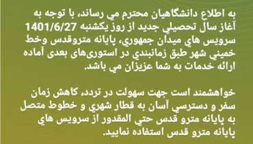 زمانبندی سرویس میدان جمهوری، پایانه مترو قدس وخط خميني شهر از روز يكشنبه 1401/6/27تا اطلاع ثانوي.